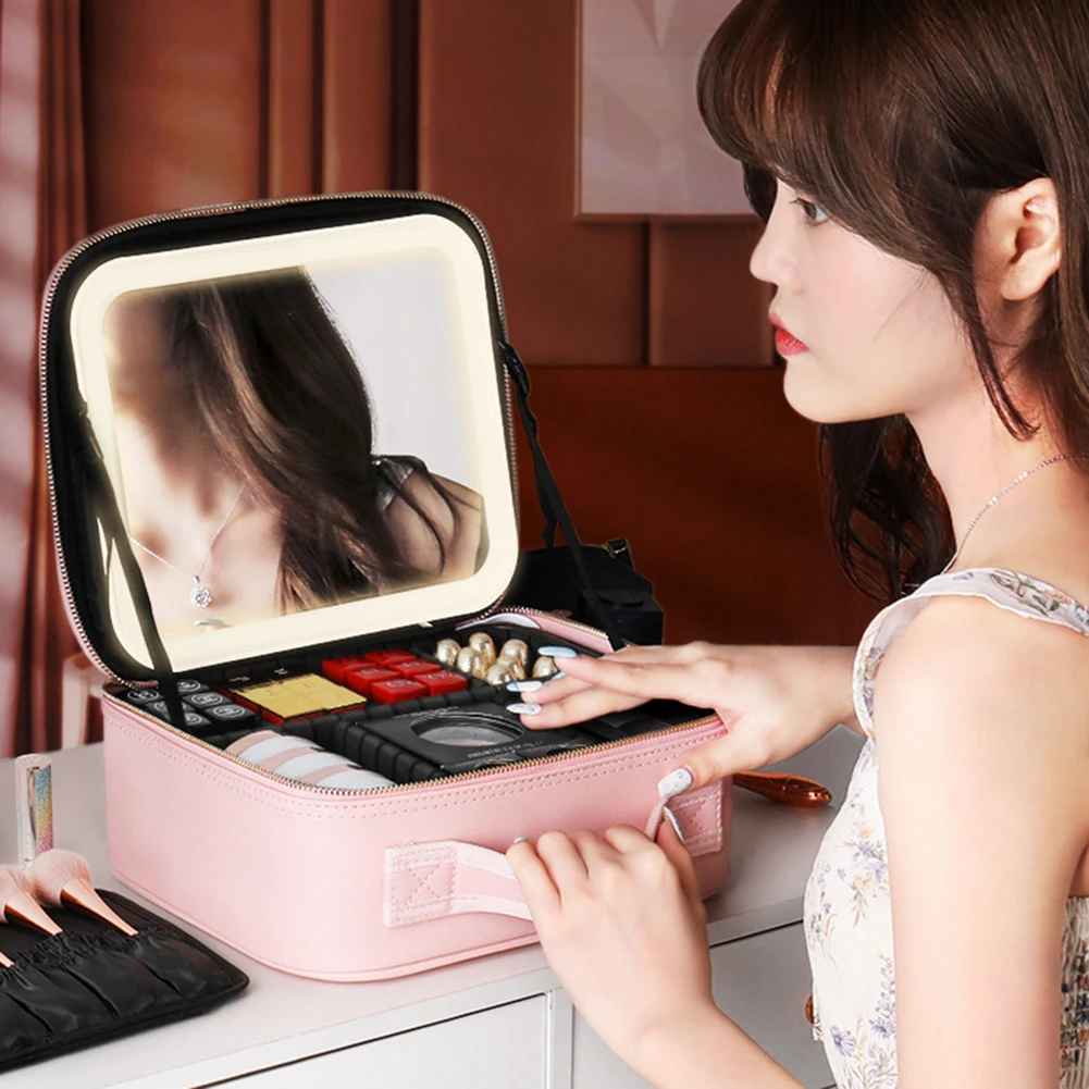 1. LED light cosmetic bag: different from ordinary cosmetic bag,this cosmetic bag is equipped with LED cosmetic mirror,76 lamp beads,which can illuminate your face 360 degrees. The light source includes natural light source,cold light source and warm light source. The light state can be adjusted at any time according to your preferences and different occasions. Make makeup clearer,more convenient,and show the perfect you. You can make up anytime and anywhere without worrying about the lack of light source.